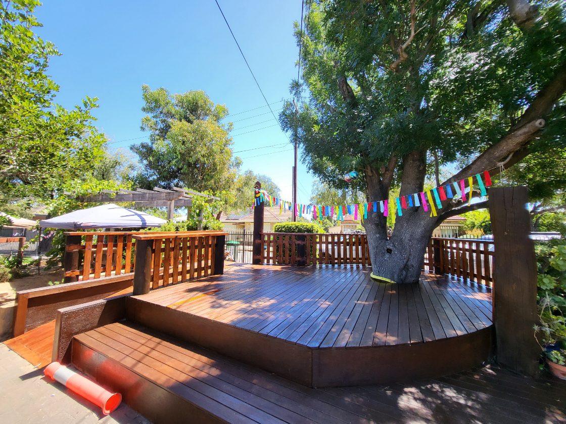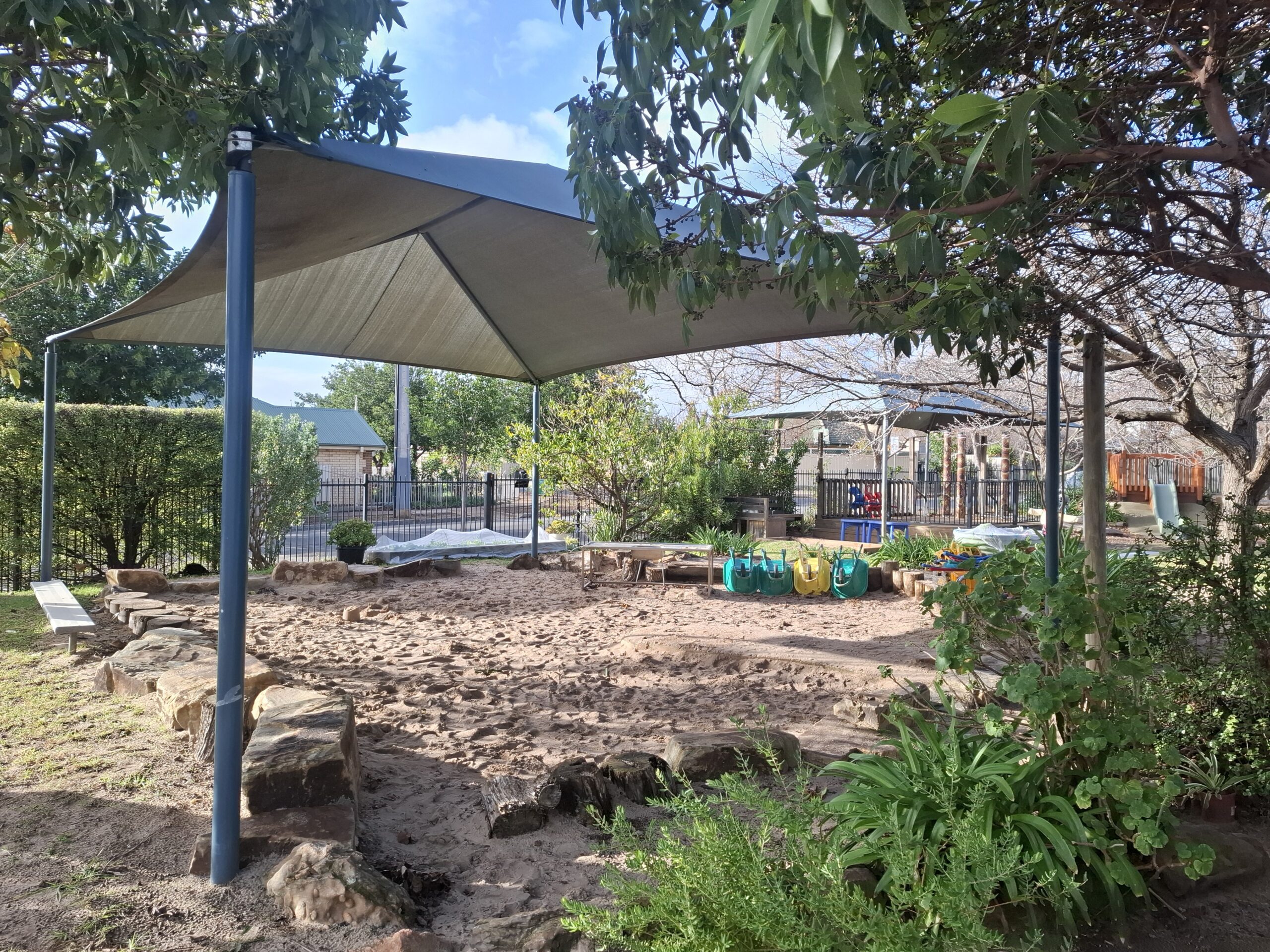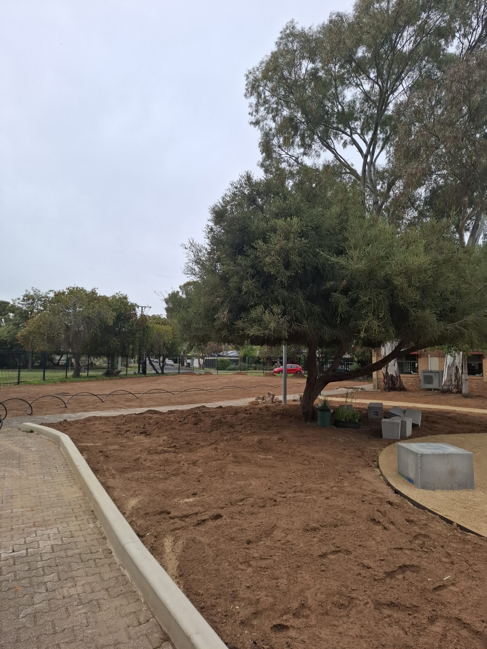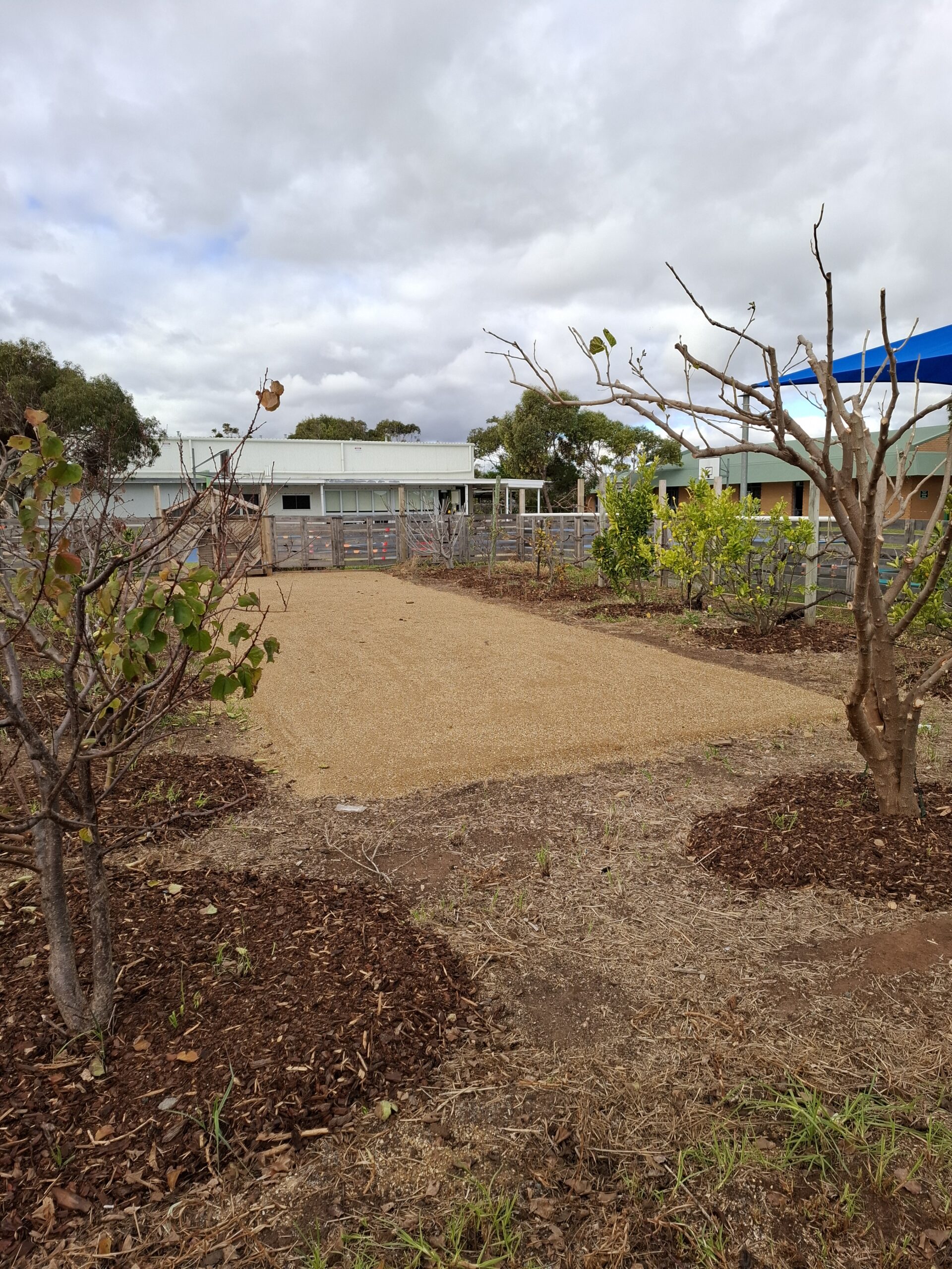 A hardstand area was added under the large tree to provide a shady space for rest and creative play in the warmer months.