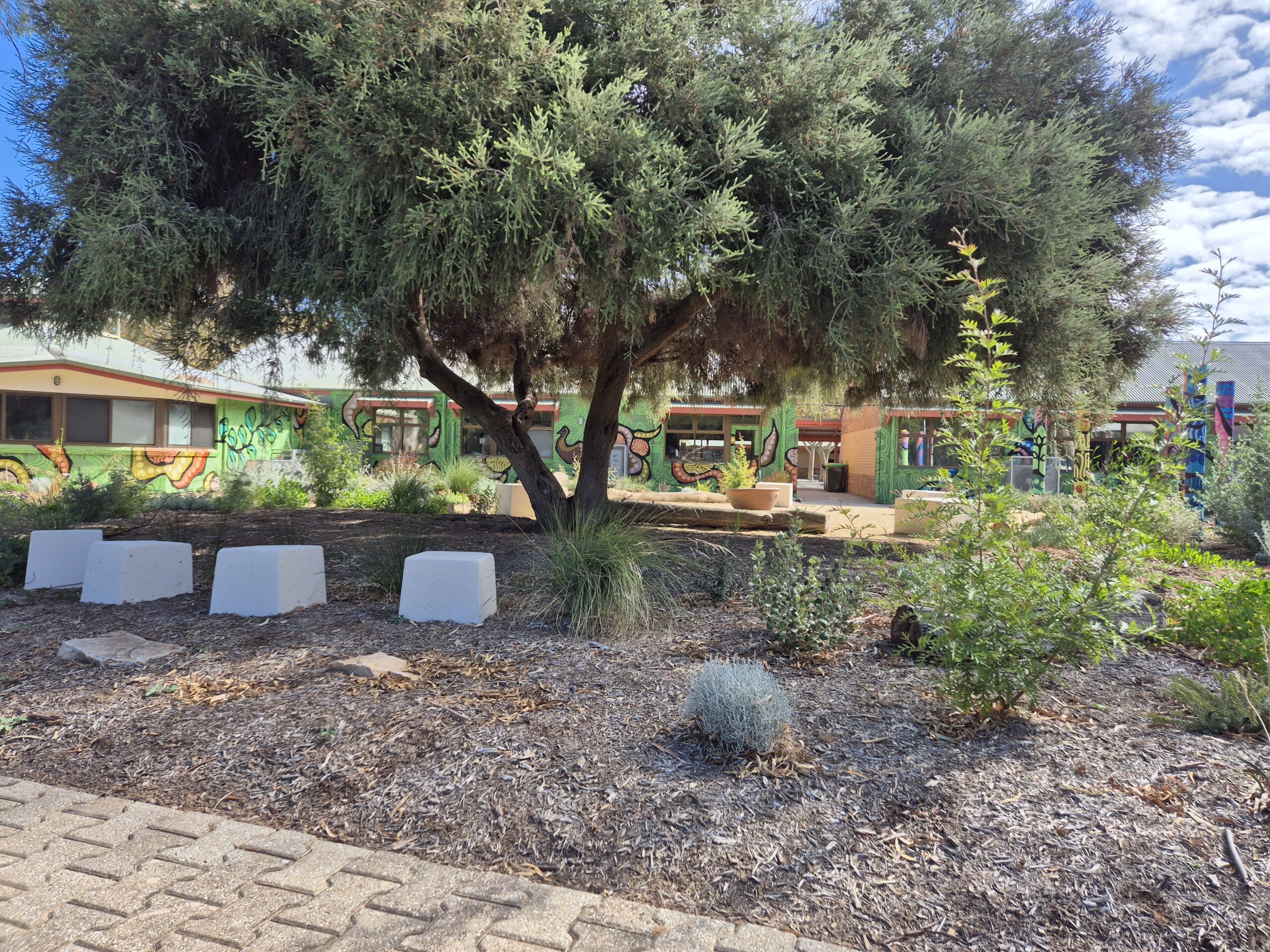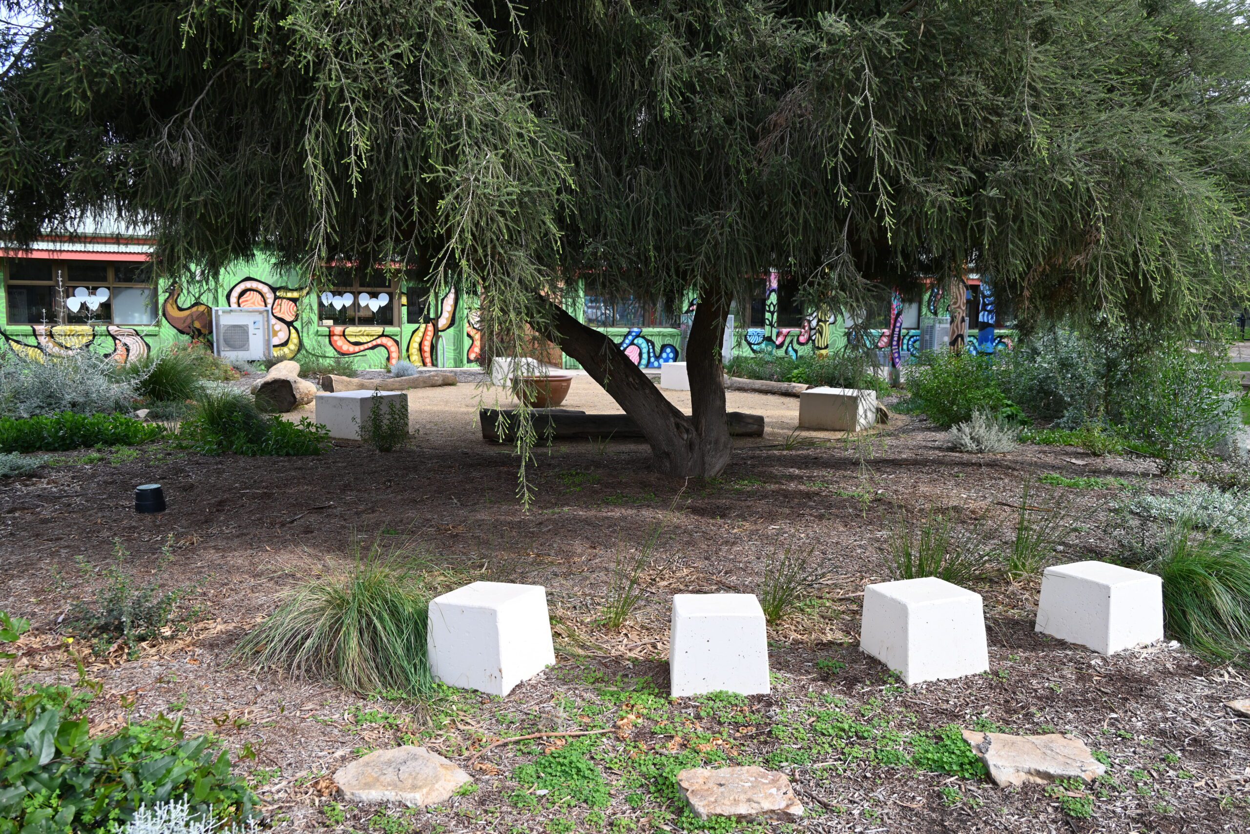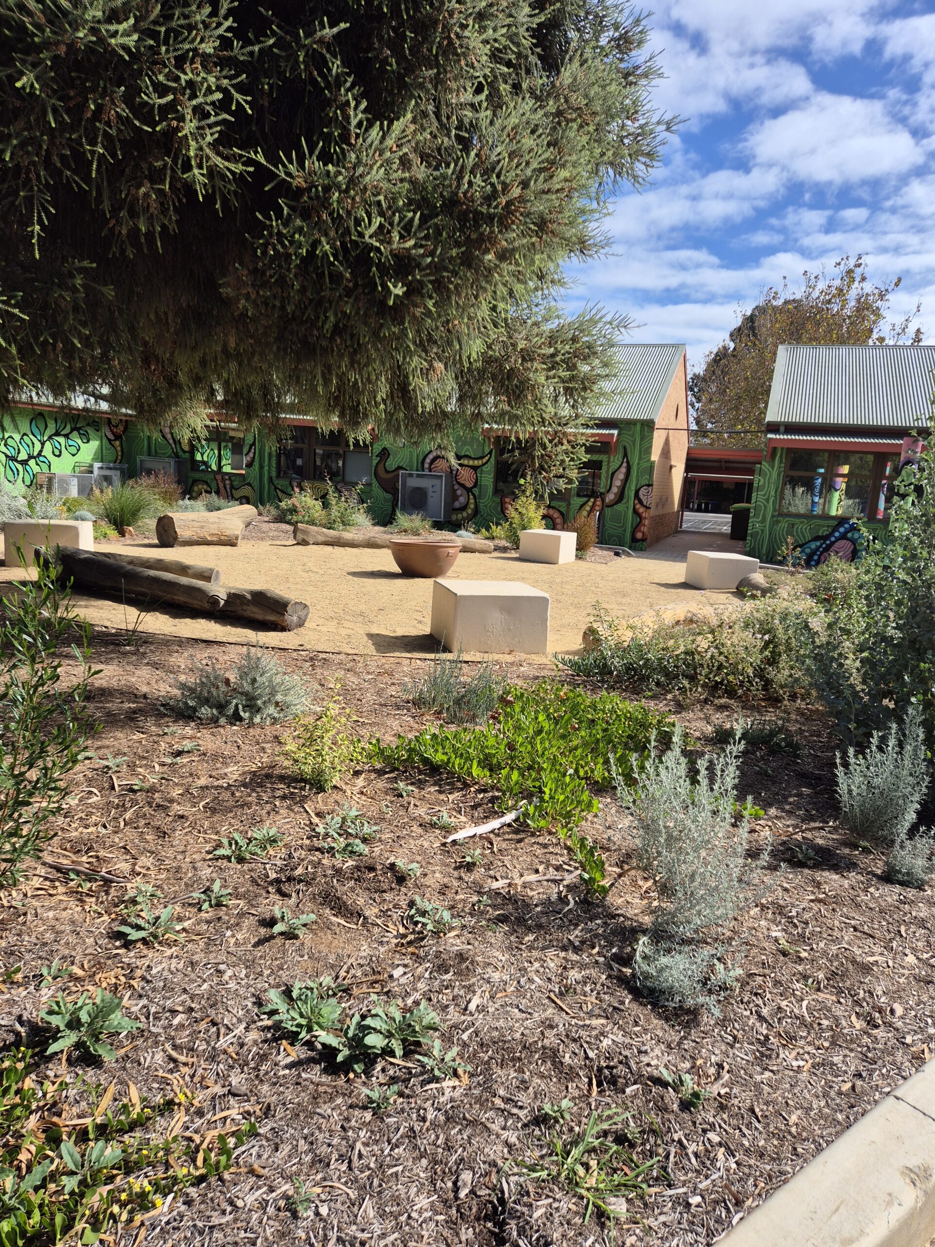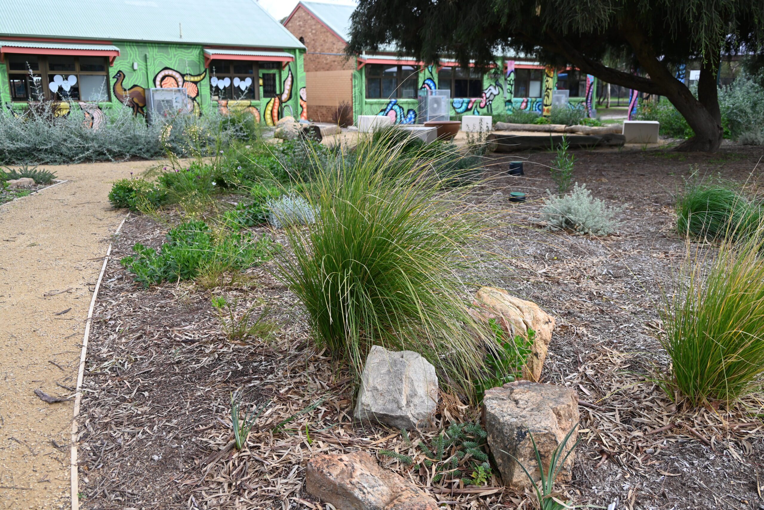 Once a bare patch next to the playground, this area now boasts a large yarning circle, interconnecting paths, informal seating, native plantings and bush tucker garden nestled in the shade of a large gum tree.