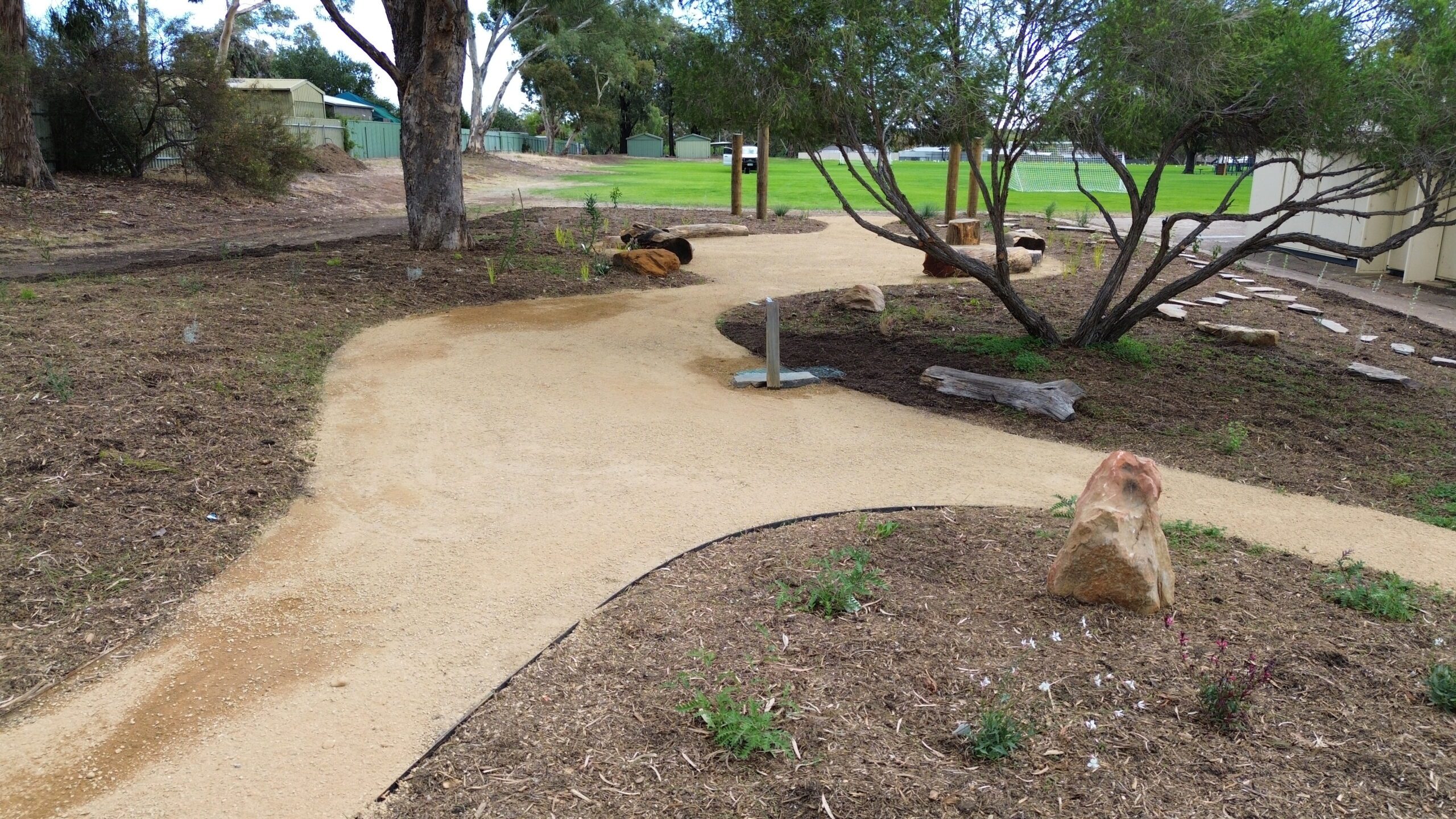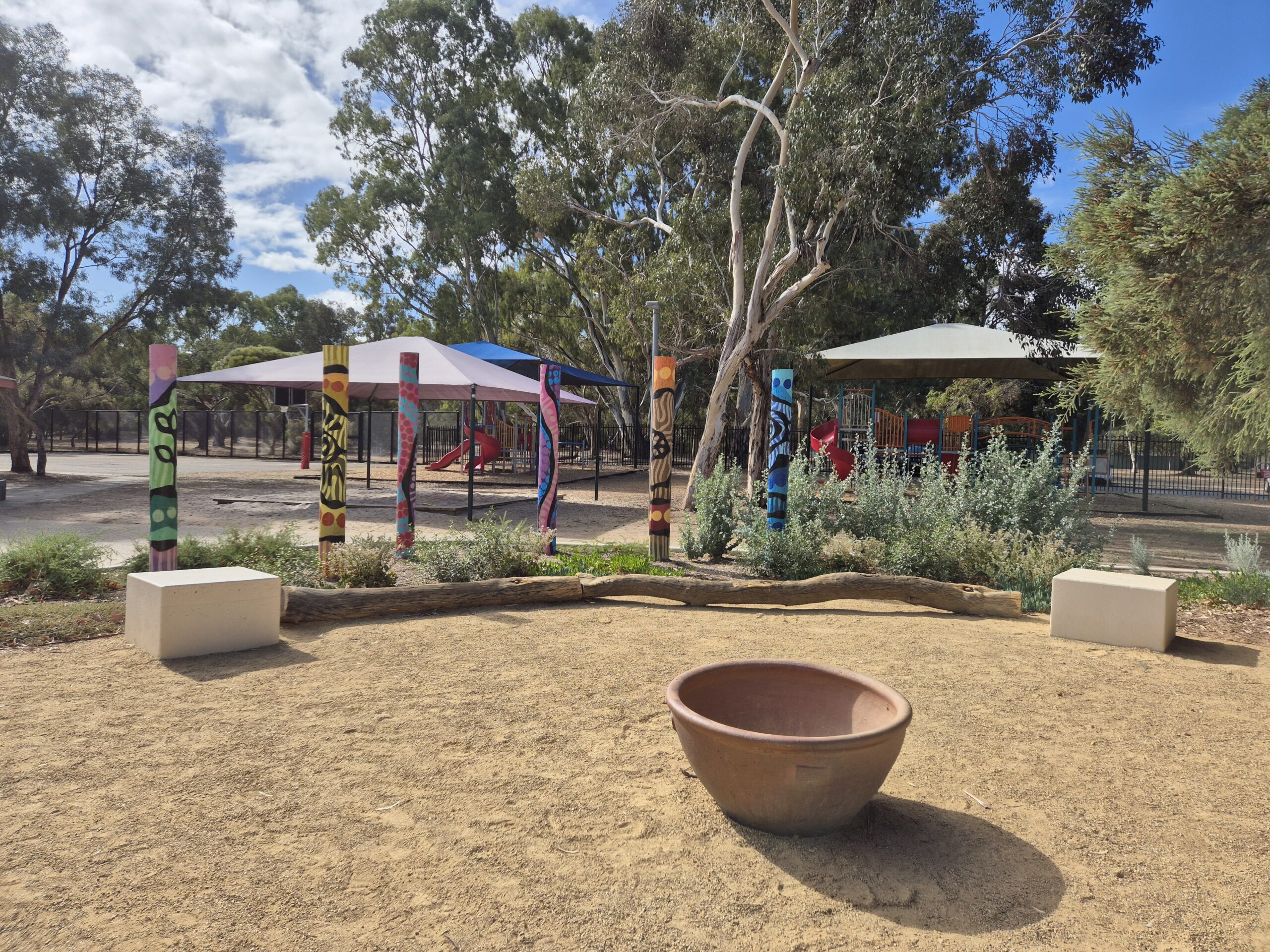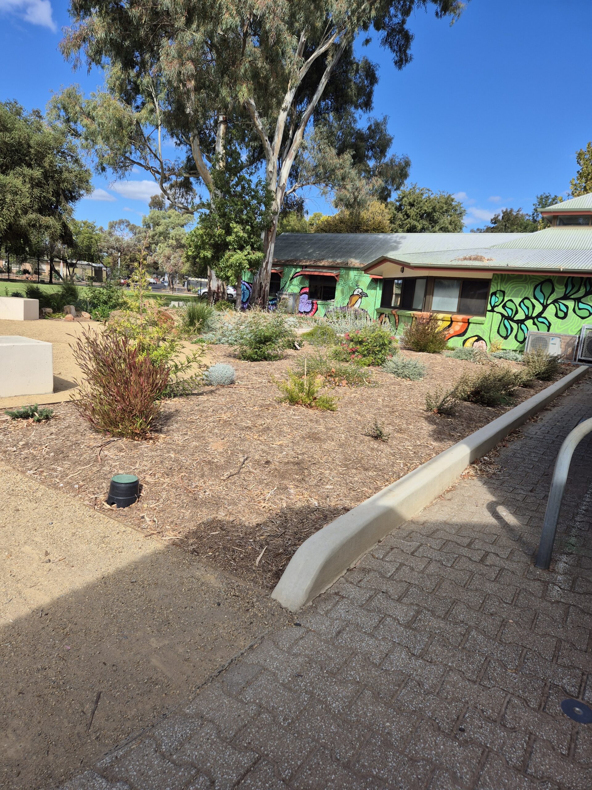Once a bare patch next to the playground, this area now boasts a large yarning circle, interconnecting paths, informal seating, native plantings and bush tucker garden nestled in the shade of a large gum tree.