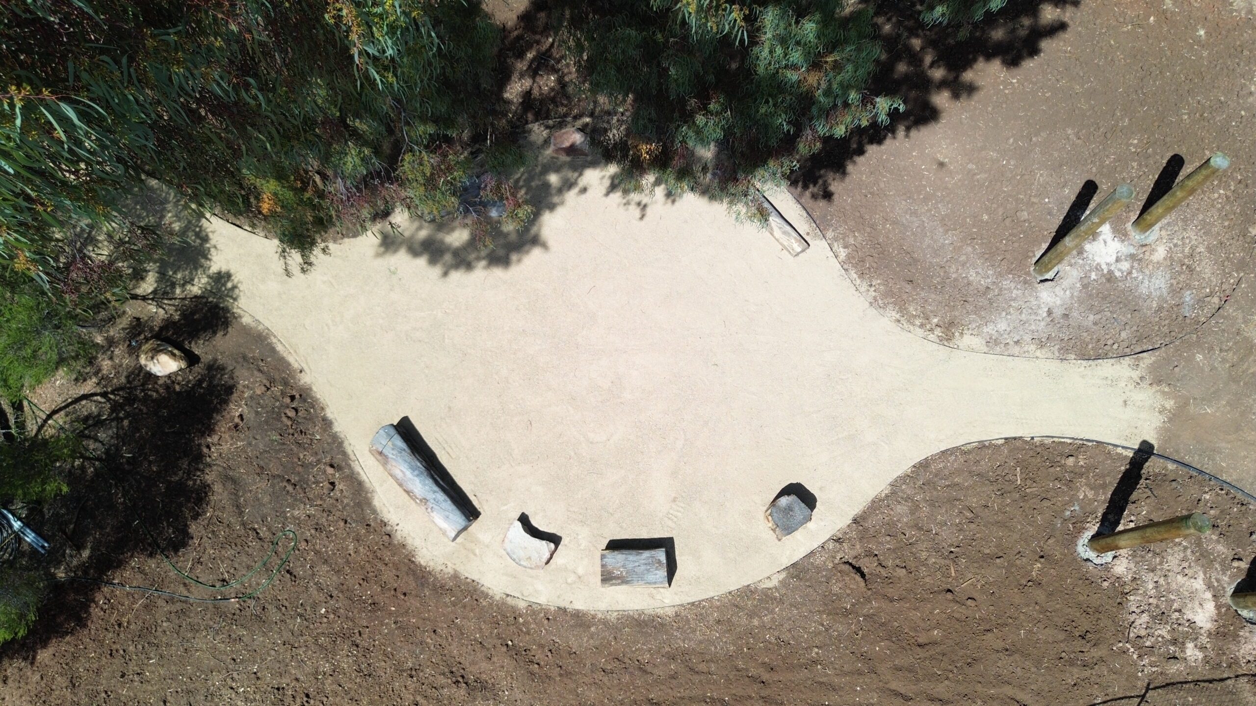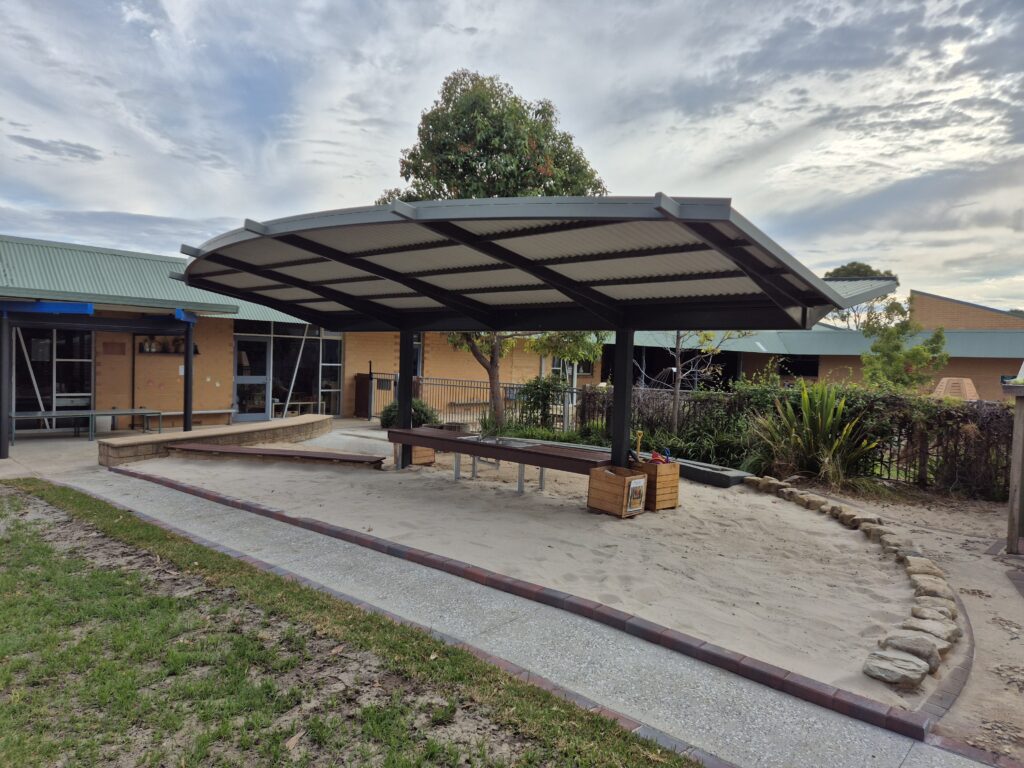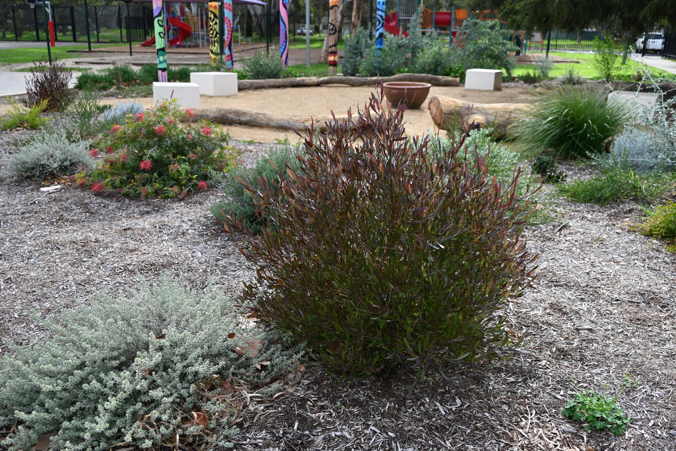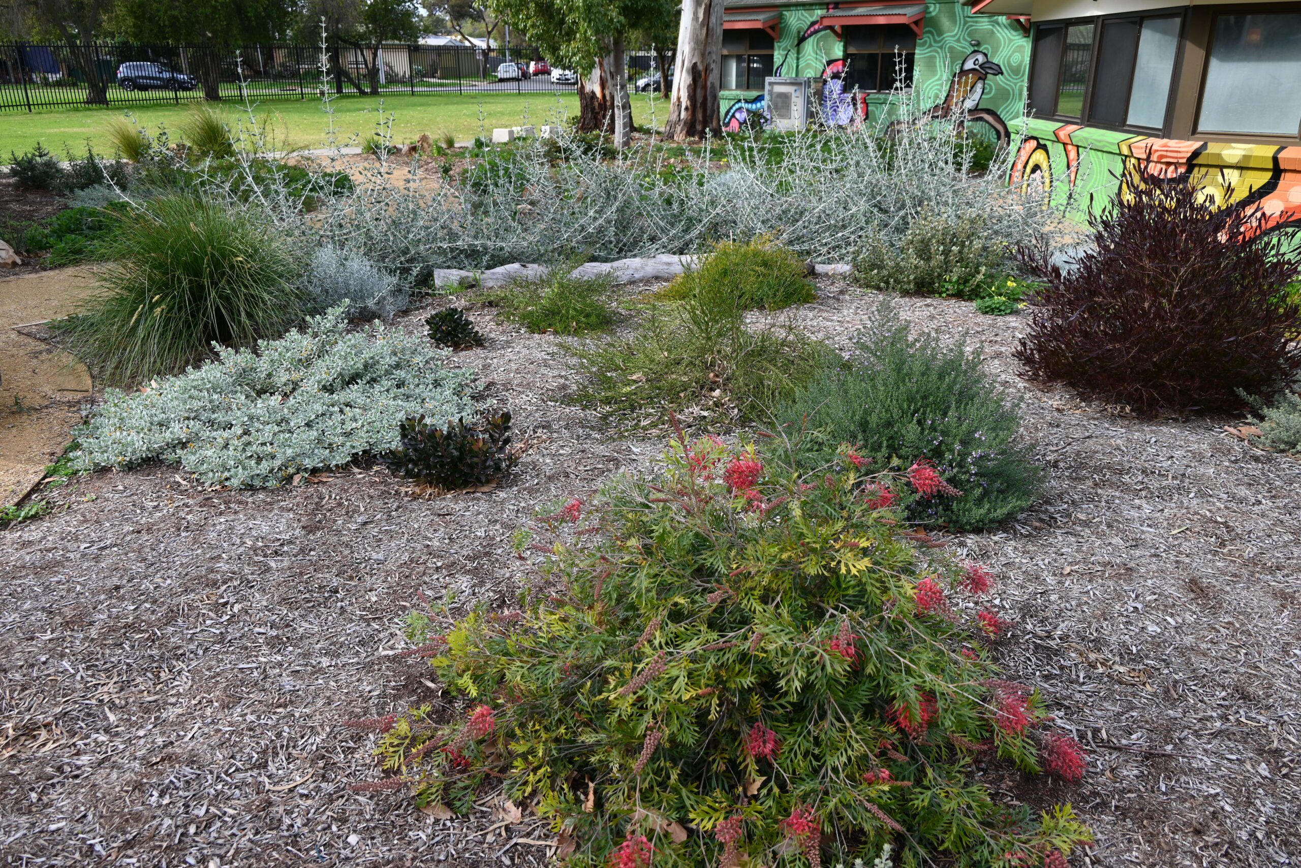 Once a bare patch next to the playground, this area now boasts a large yarning circle, interconnecting paths, informal seating, native plantings and bush tucker garden nestled in the shade of a large gum tree.